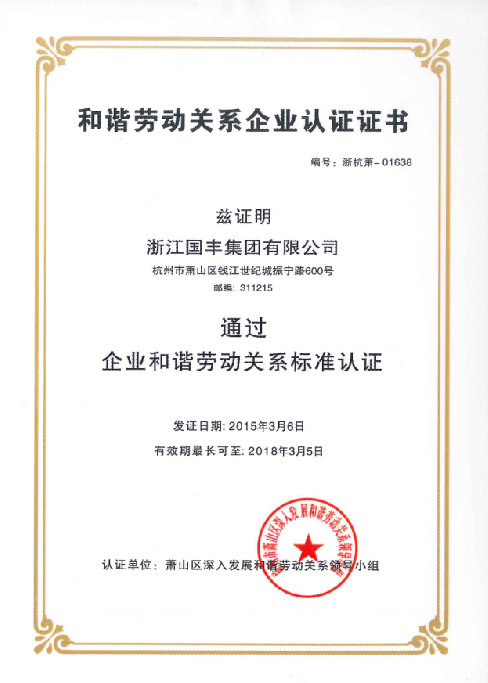 2015年3月6日,浙江國豐集團有限公司順利通過了企業(yè)和諧勞動關系標準認證。