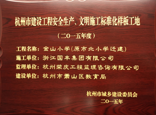 2015年11月9日,浙江國(guó)豐集團(tuán)有限公司承建的金山小學(xué)(原市北小學(xué)遷建)工程榮獲杭州市建設(shè)工程安全生產(chǎn)、文明施工標(biāo)準(zhǔn)化樣板工地。