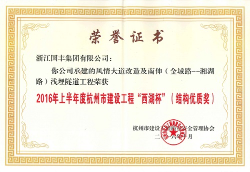 2016年10月,浙江國豐集團有限公司承建的風(fēng)情大道改造及南伸(金城路--湘湖路)淺埋隧道工程榮獲2016年上半年度杭州市建設(shè)工程“西湖杯”(結(jié)構(gòu)優(yōu)質(zhì)獎)。