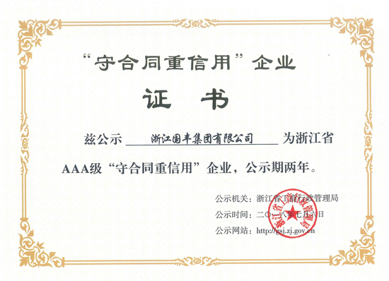 2018年7月6日,浙江國豐集團有限公司再次榮獲浙江省工商企業(yè)信用AAA級“守合同 重信用”企業(yè)稱號。