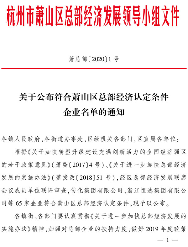 2020年9月,國(guó)豐集團(tuán)被認(rèn)定為2019年度蕭山區(qū)總部經(jīng)濟(jì)企業(yè)。