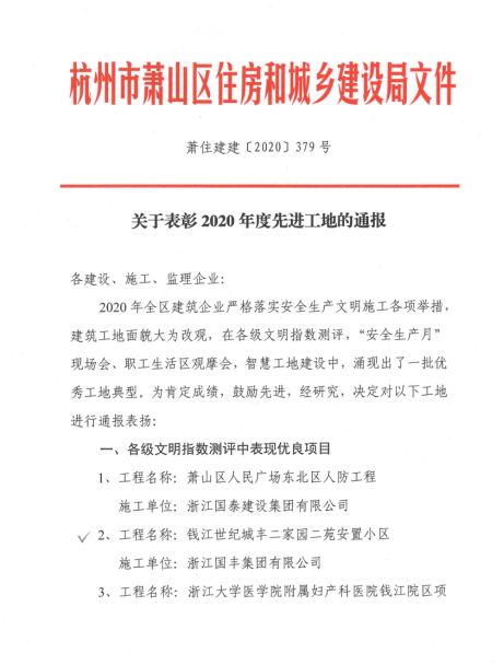 2020年12月,錢江世紀城豐二家園二苑安置小區(qū)、錢江世紀城豐東家園安置小區(qū)榮獲2020年度各級文明指數(shù)測評中表現(xiàn)優(yōu)良項目。