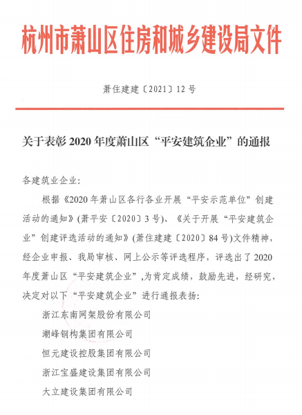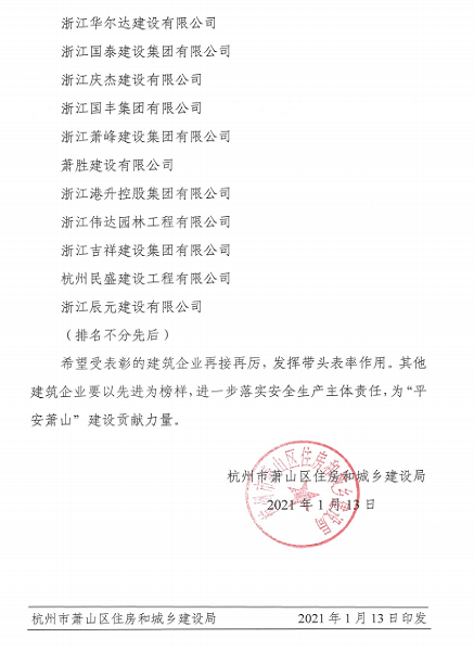2021年1月,國豐集團(tuán)國豐集團(tuán)榮獲2020年度蕭山區(qū)“平安建筑企業(yè)”。
