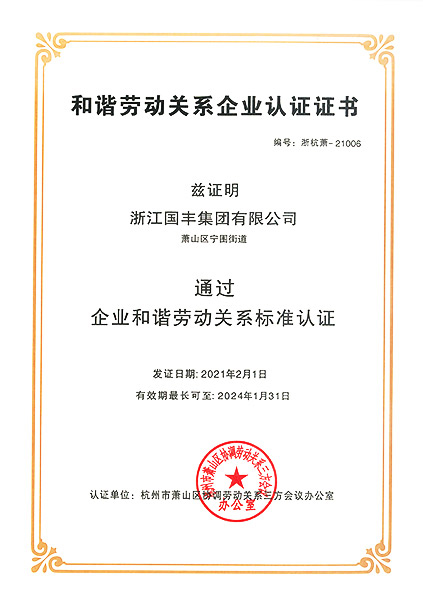 2021年2月,國豐集團(tuán)通過蕭山區(qū)和諧勞動(dòng)關(guān)系企業(yè)認(rèn)證。