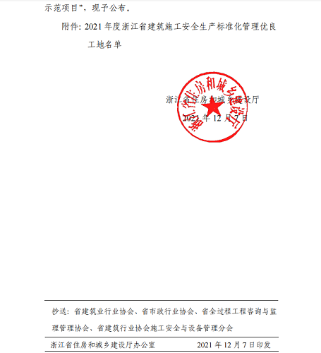 2021年12月,建院綜合樓、城東分類減量綜合體、大毛塢-仁和大道供水管道工程I標(biāo)等三個(gè)項(xiàng)目榮獲2021年度浙江省建筑施工安全生產(chǎn)標(biāo)準(zhǔn)化管理優(yōu)良工地。