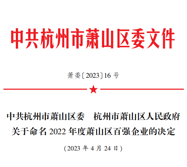 2023年4月,國豐集團榮獲2022年度蕭山區(qū)百強企業(yè)。