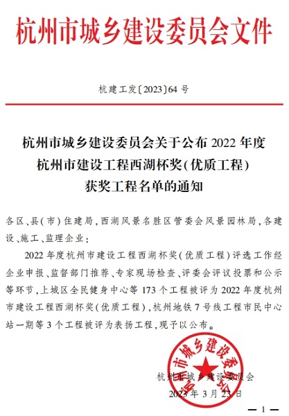 2023年3月,豐東家園安置小區(qū)、豐二家園二苑安置小區(qū)、天德幼兒園、建院綜合樓、城東分類減量綜合體等5個項目榮獲2022年度杭州市建設(shè)工程西湖杯獎(優(yōu)質(zhì)工程)。