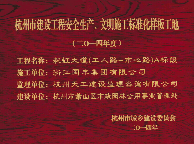 2014年11月4日,浙江國豐集團有限公司承建的彩虹大道(工人路---市心路)A標段工程榮獲杭州市建設工程安全生產(chǎn)、文明標準化樣板工地。