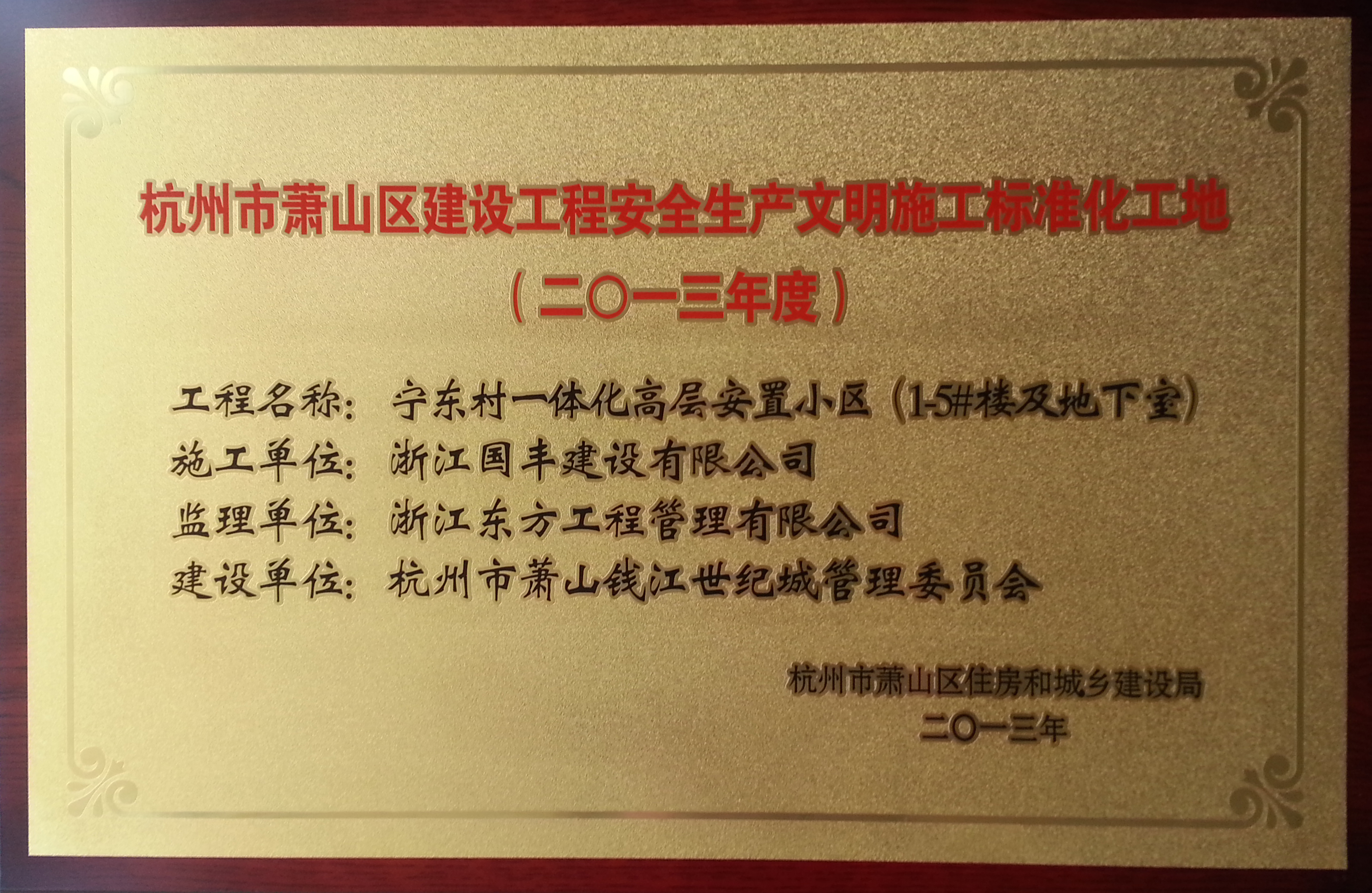 2013年11月8日,浙江國豐建設(shè)有限公司被評(píng)為“2013年度杭州市建設(shè)工程安全生產(chǎn)、文明施工標(biāo)準(zhǔn)化樣板工地”,工程分別為:豐二高層安置小區(qū)一期1標(biāo)1#、2#、3#、7#及1#地下車庫、寧東村一體化高層安置小區(qū)(1-5#樓及地下室)。