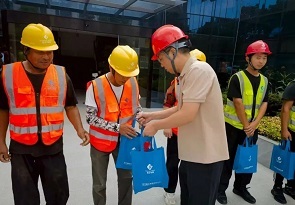 來到項(xiàng)目現(xiàn)場,集團(tuán)班子領(lǐng)導(dǎo)將公司精心準(zhǔn)備的慰問品逐一發(fā)到一線員工手中。一份份防暑藥品、清涼用品、洗護(hù)用品寄托著公司對一線員工們辛勤付出的深深敬意和深切關(guān)懷。