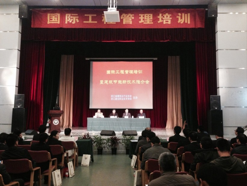 浙江省建筑行業(yè)協(xié)會(huì)聯(lián)合浙江建設(shè)職業(yè)技術(shù)學(xué)院于2013年11月23 日在浙江建設(shè)職業(yè)技術(shù)學(xué)院舉辦了“國(guó)際工程管理培訓(xùn)暨建筑節(jié)能新技術(shù)推介會(huì)”。此次培訓(xùn)推介會(huì)旨在滿足建筑企業(yè)對(duì)國(guó)際工程項(xiàng)目管理人才的需要,推廣節(jié)能保溫材料在建筑領(lǐng)域的應(yīng)用。