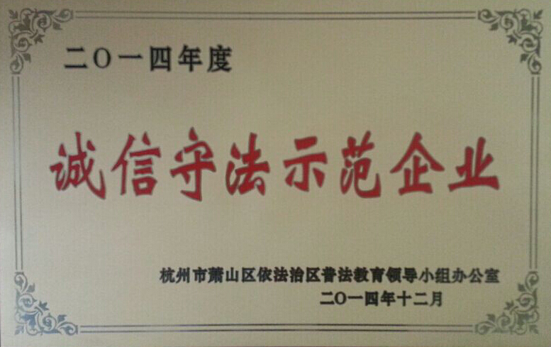 近日,在由蕭山區(qū)經(jīng)信局、工商局、稅務(wù)局、司法局、安監(jiān)局、人社局、普法領(lǐng)導(dǎo)小組辦公室開展的2014年度蕭山區(qū)“誠信守法示范企業(yè)”評選活動中,我集團(tuán)順利通過申報(bào)、業(yè)務(wù)培訓(xùn)、考核驗(yàn)收、否定性指標(biāo)把關(guān)及公示等環(huán)節(jié),榮獲了2014年度蕭山區(qū)“誠信守法示范企業(yè)”榮譽(yù)稱號。
