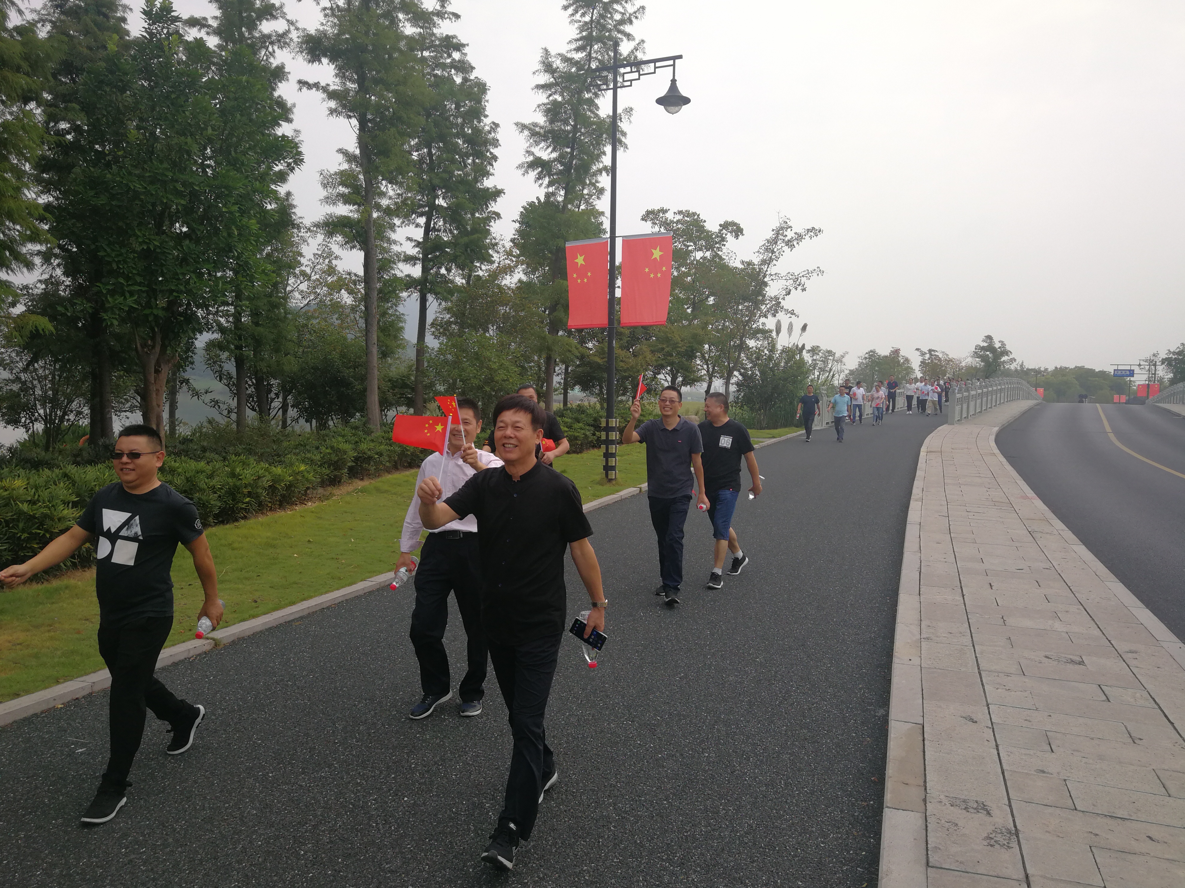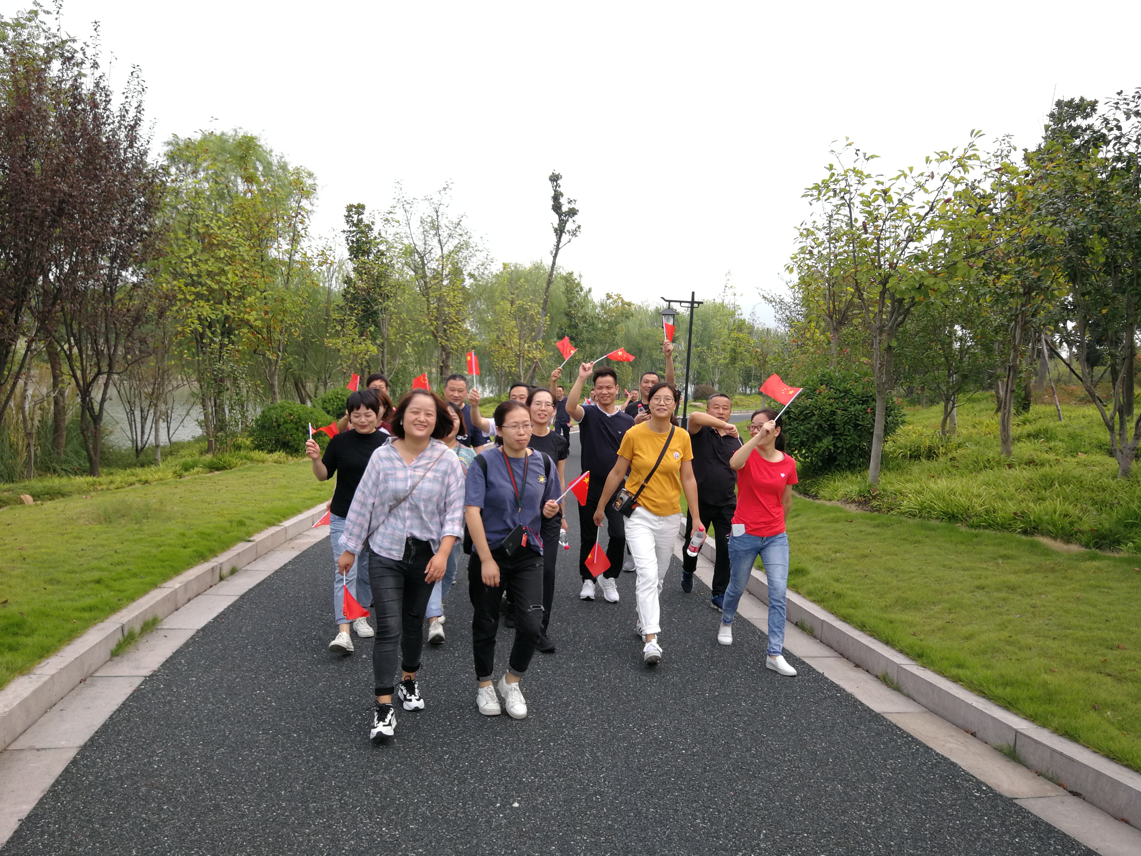每位員工手持五星紅旗,精神抖擻、闊步前行。在途中,既欣賞了湘湖美景,體驗了暢行樂趣,同時也感受到了新中國成立70年來家鄉(xiāng)的發(fā)展變化。一路走來,歡聲笑語,其樂融融。