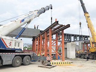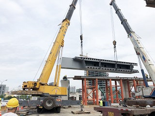 6月14日10時(shí),隨著第一節(jié)鋼箱梁安全、平穩(wěn)地吊裝就位在彩虹高架5號(hào)橋墩上,由我集團(tuán)承建的彩虹大道二期工程鋼箱梁首次吊裝取得圓滿成功,標(biāo)志著該工程進(jìn)入鋼箱梁施工階段。