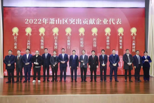 會議表彰了2022年度蕭山區(qū)突出貢獻(xiàn)企業(yè),浙江國豐集團(tuán)榮獲“2022年度蕭山區(qū)突出貢獻(xiàn)企業(yè)”,集團(tuán)董事長俞文燦出席會議并上臺領(lǐng)獎(jiǎng)。