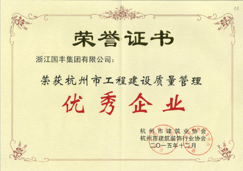 2015年12月28日,浙江國豐集團(tuán)有限公司榮獲杭州市工程建設(shè)質(zhì)量管理優(yōu)秀企業(yè)。