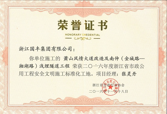 2016年11月18日,浙江國豐集團(tuán)有限公司承建的蕭山風(fēng)情大道改造及南伸(金城路---湘湖路)淺埋隧道工程榮獲2016年度浙江省市政公用工程安全文明施工標(biāo)準(zhǔn)化工地。