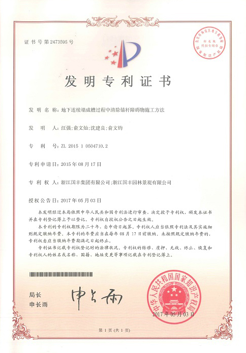 2017年5月,集團自主研發(fā)的《地下連續(xù)墻成槽過程中清除錨桿障礙物施工方法》獲得了國家發(fā)明專利。