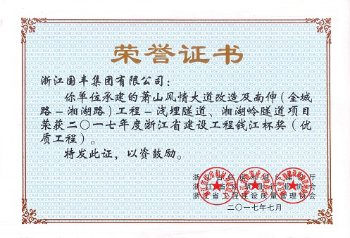 2017年7月,國豐集團承建的蕭山風情大道改造及南伸(金城路-湘湖路)工程-淺埋隧道-湘湖嶺隧道項目榮獲2017年浙江省建設工程錢江杯獎(優(yōu)質(zhì)工程)。