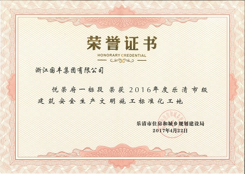 2017年4月,浙江國豐集團有限公司承建的悅榮府一標(biāo)段工程榮獲2016年度樂清市級建筑安全生產(chǎn)文明施工標(biāo)準(zhǔn)化工地。