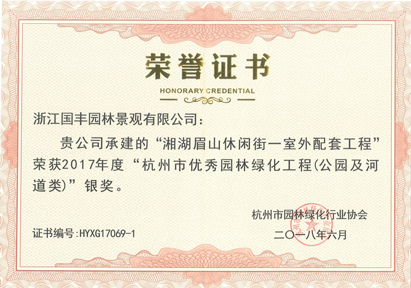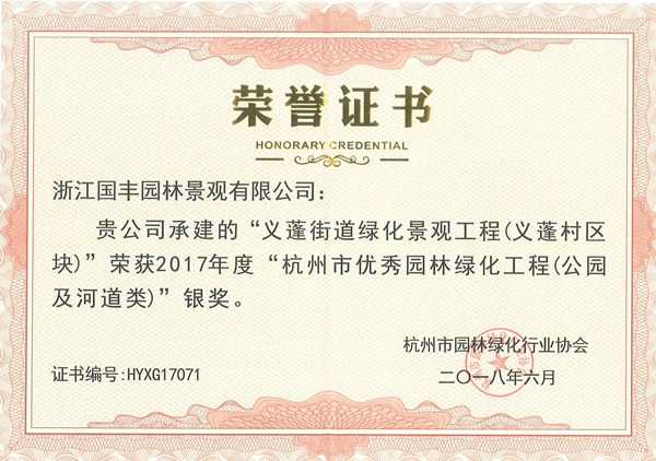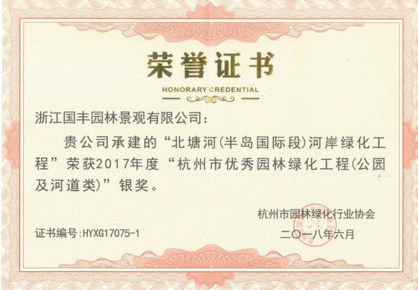 2018年6月,北塘河(半島國際段)河岸綠化工程、湘湖眉山休閑街-室外配套工程、義蓬街道綠化景觀工程(義蓬村區(qū)塊)榮獲2017年度“杭州市優(yōu)秀園林綠化工程(公園及河道類)”銀獎。