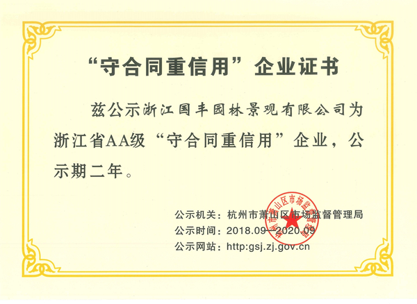 2018年9月,浙江國豐園林景觀有限公司榮獲浙江省AA級“守合同 重信用”企業(yè)稱號。