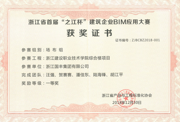 2018年12月,浙江國(guó)豐集團(tuán)榮獲省首屆“之江杯”建筑企業(yè)BIM應(yīng)用大賽一等獎(jiǎng) 。