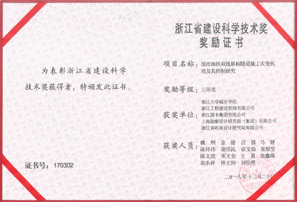 2018年12月,浙江國豐集團(tuán)參與實(shí)施的“城市地鐵雙線盾構(gòu)隧道施工災(zāi)變機(jī)理及其控制研究”項(xiàng)目榮獲“浙江省建設(shè)科學(xué)技術(shù)獎(jiǎng)”三等獎(jiǎng)。