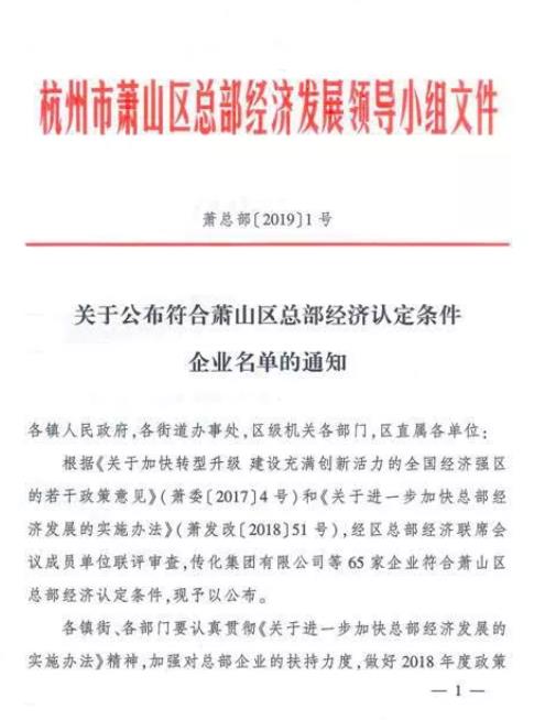 2019年7月,國豐集團被認定為2018年度蕭山區(qū)總部經(jīng)濟企業(yè)。
