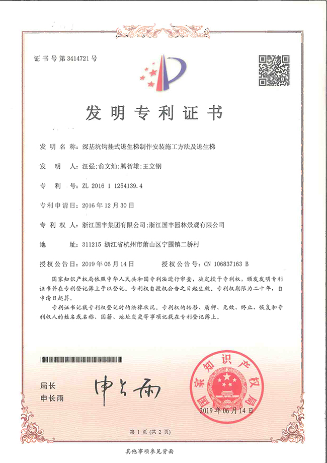 2019年6月, 深基坑鉤掛式逃生梯制作安裝施工方法及逃生梯獲得發(fā)明專利。