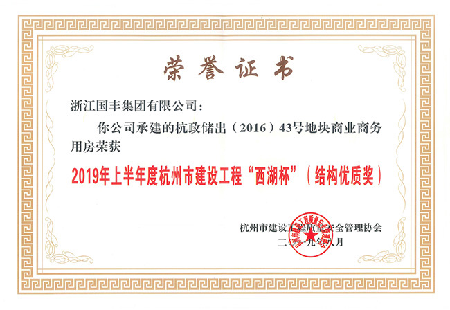 2019年8月,杭政儲出(2016)43號地塊商業(yè)商務用房榮獲2019上半年度杭州市建設工程“西湖杯”(結(jié)構(gòu)優(yōu)質(zhì)獎)。