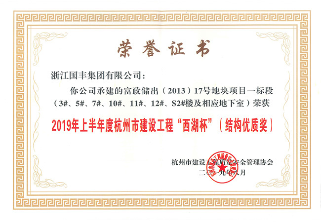 2019年8月,富政儲(chǔ)出(2013)17號(hào)地塊項(xiàng)目一標(biāo)段榮獲2019上半年度杭州市建設(shè)工程“西湖杯”(結(jié)構(gòu)優(yōu)質(zhì)獎(jiǎng))。