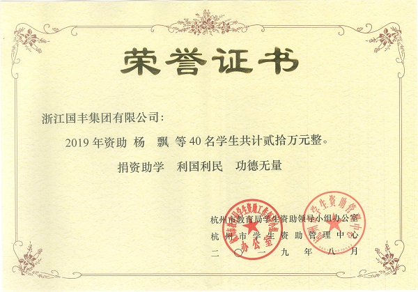 2019年8月,國豐集團資助40名學(xué)生共計20萬元整。