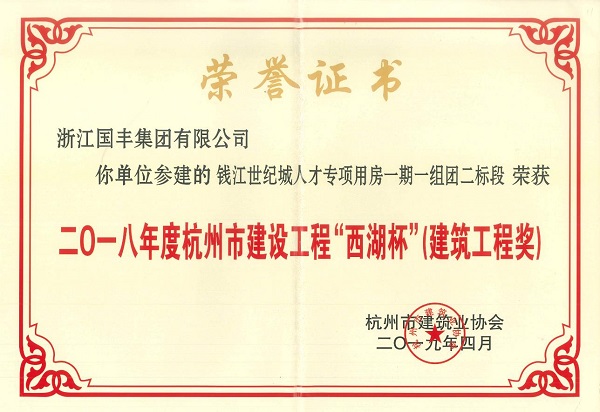 2019年4月,錢江世紀(jì)城人才專項(xiàng)用房一期一組團(tuán)二標(biāo)段榮獲2018年度杭州市建設(shè)工程“西湖杯”建筑工程獎(jiǎng)。