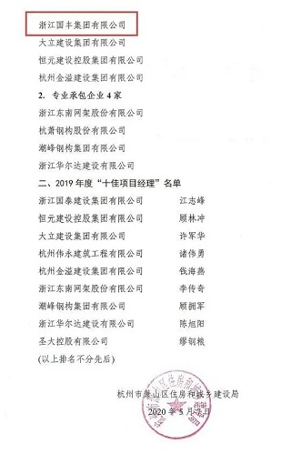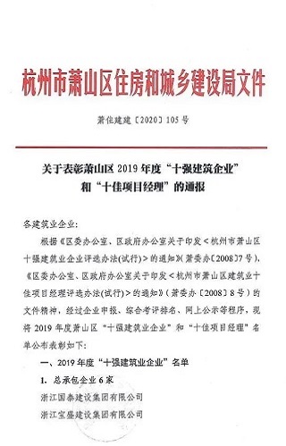 2020年5月,國豐集團(tuán)榮獲蕭山區(qū)2019年度“十強(qiáng)建筑業(yè)企業(yè)”。
