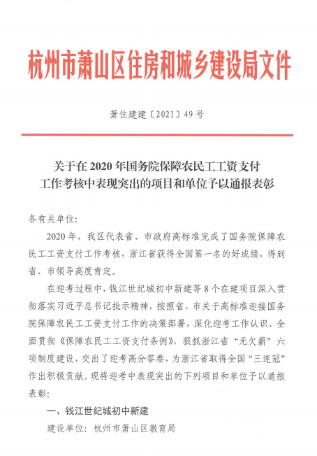 2021年3月,錢江世紀(jì)城豐二家園二苑安置小區(qū)榮獲在2020年國務(wù)院保障農(nóng)民工工資支付工作考核中表現(xiàn)突出項(xiàng)目。