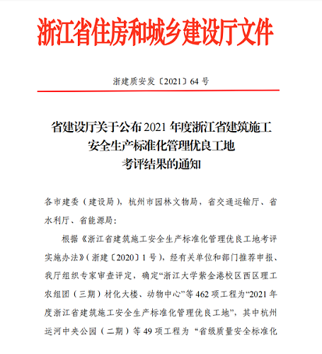 2021年12月,建院綜合樓、城東分類減量綜合體、大毛塢-仁和大道供水管道工程I標(biāo)等三個(gè)項(xiàng)目榮獲2021年度浙江省建筑施工安全生產(chǎn)標(biāo)準(zhǔn)化管理優(yōu)良工地。