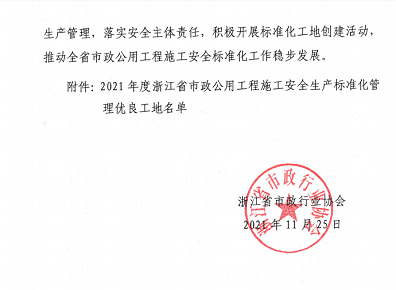 2021年11月,城東分類減量綜合體、大毛塢-仁和大道供水管道工程I標等兩個項目榮獲2021年度浙江省市政公用工程施工安全生產標準化管理優(yōu)良工地。