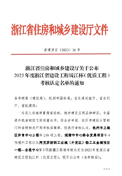 2023年8月,建院綜合樓、城東分類(lèi)減量綜合體等2個(gè)項(xiàng)目榮獲2023年度浙江省“錢(qián)江杯”優(yōu)質(zhì)工程獎(jiǎng)。