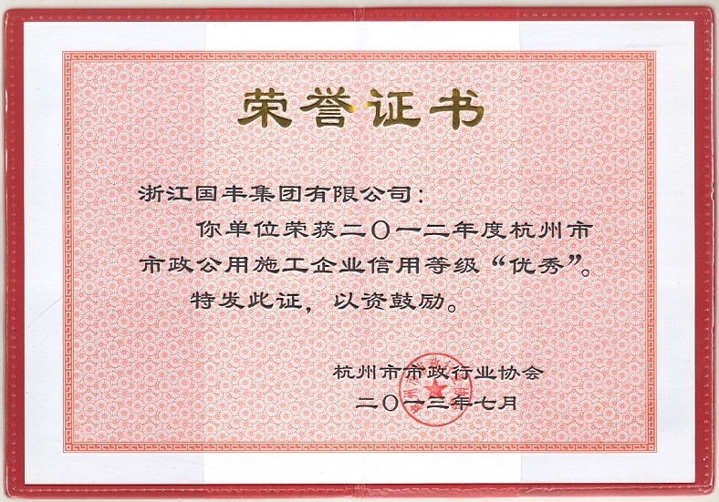 2013年7月,浙江國(guó)豐集團(tuán)有限公司榮獲“二O一二年度杭州市市政公用施工企業(yè)信用等級(jí)‘優(yōu)秀’”。