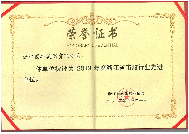 2014年1月20日,浙江國豐集團(tuán)有限公司被評為“2013年度浙江省市政行業(yè)先進(jìn)單位”。