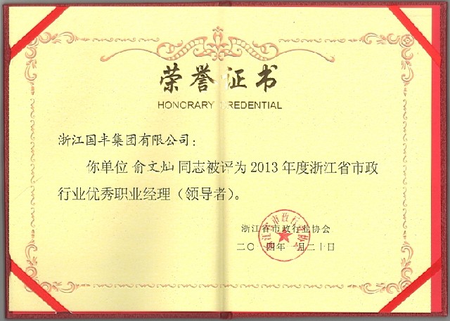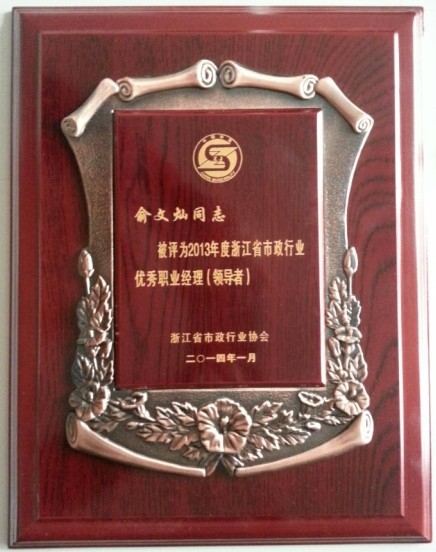 2014年1月20日,俞文燦總經理被評為“2013年度浙江省市政行業(yè)優(yōu)秀職業(yè)經理(領導者)”。