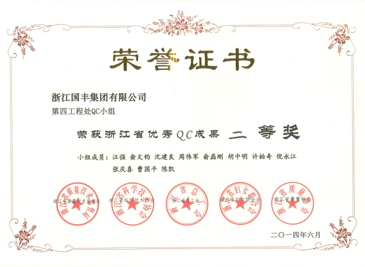 2014年6月,浙江國(guó)豐集團(tuán)有限公司第四工程處QC小組榮獲浙江省優(yōu)秀QC成果二等獎(jiǎng)。