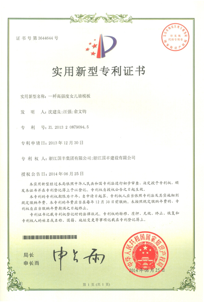 2014年10月11日,浙江國(guó)豐集團(tuán)有限公司和浙江國(guó)豐建設(shè)有限公司取得“一種高強(qiáng)度女兒墻模板”的實(shí)用新型專利證書(shū)。
