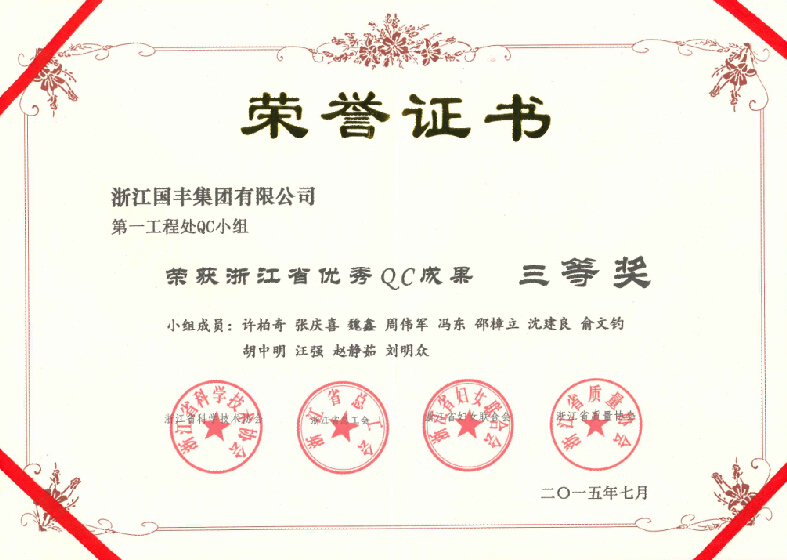 2015年7月6日,浙江國(guó)豐集團(tuán)有限公司第一工程處QC小組榮獲浙江省優(yōu)秀QC成果三等獎(jiǎng)。