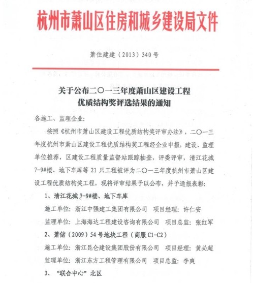 2013年12月20日,浙江國豐建設(shè)有限公司“聯(lián)合中心”北區(qū)被評為“2013年度杭州市蕭山區(qū)建設(shè)工程優(yōu)質(zhì)結(jié)構(gòu)獎工程”。