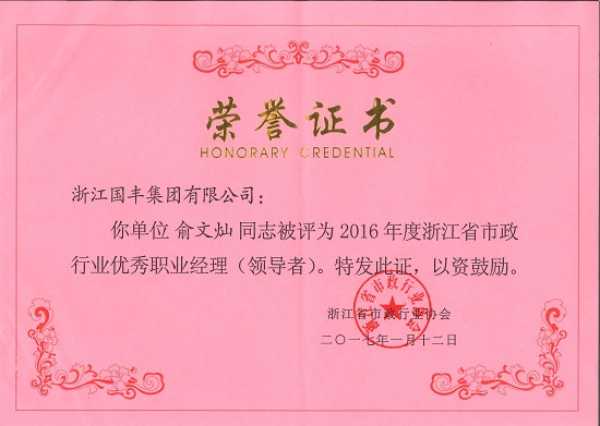 2017年1月12日,俞文燦董事長被評為“2016年度浙江省市政行業(yè)優(yōu)秀職業(yè)經(jīng)理(領導者)”。
