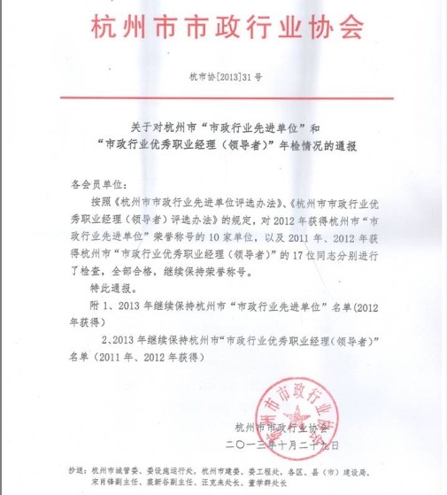 2013年10月29日,浙江國(guó)豐集團(tuán)有限公司被評(píng)為“2013年度杭州市市政行業(yè)先進(jìn)單位”。