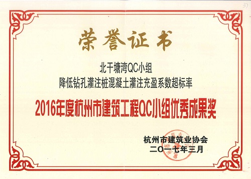 2017年3月,浙江國豐集團有限公司北干塘灣QC小組“降低鉆孔灌注樁混凝土灌注充盈系數(shù)超標率”榮獲2016年度杭州市建筑工程QC小組優(yōu)秀成果獎。