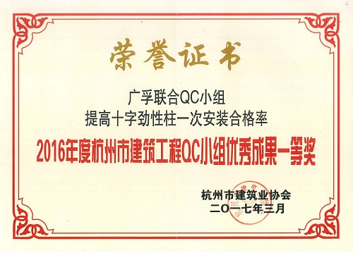 2017年3月,浙江國豐集團有限公司廣孚聯(lián)合QC小組“提高十字勁性柱一次安裝合格率”被評為2016年度杭州市建筑工程QC小組優(yōu)秀成果一等獎。